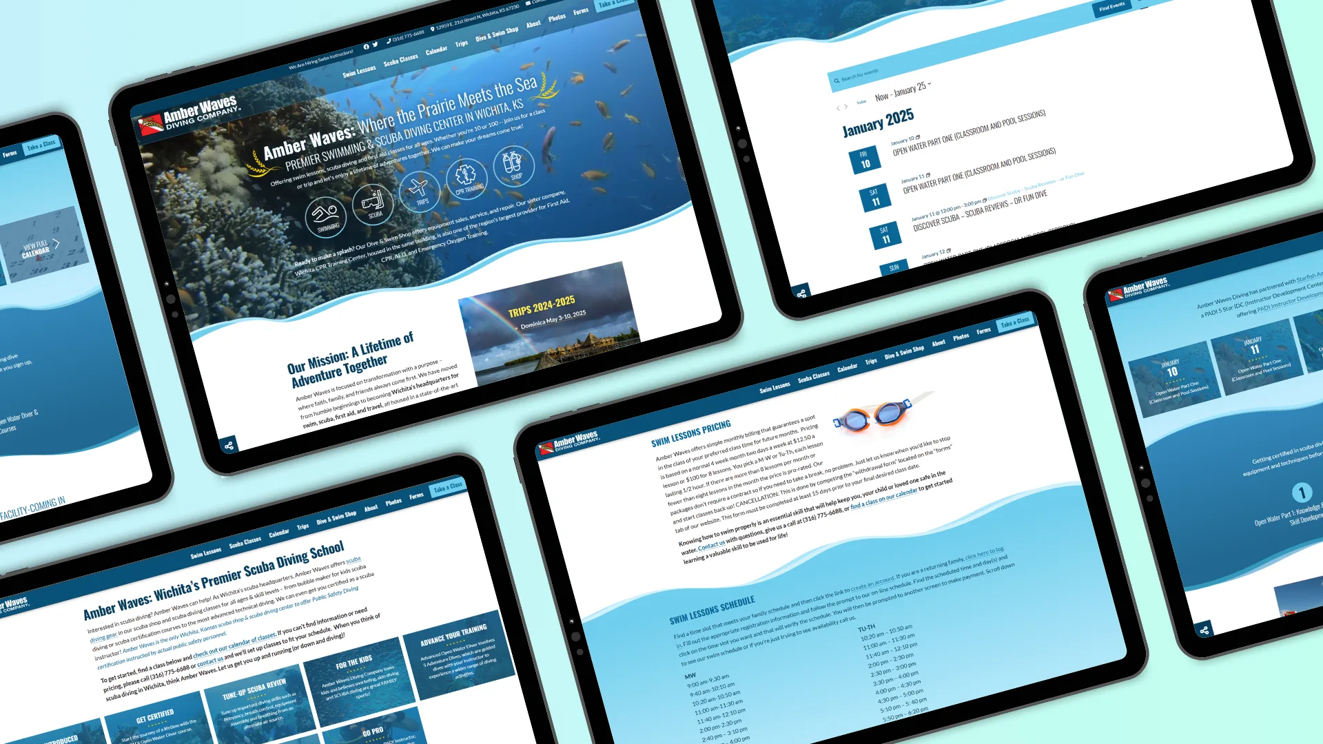 Amber Waves Diving Co. started in 2008 and has become Wichita’s headquarters for swim, scuba, first aid, and travel. They recently opened a 10,500 sq. ft. state-of-the-art facility and needed a more modern website to help promote it. We did a complete overhaul of their website using WordPress to create a fun, dynamic layout that is more organized, user-friendly, and easy to manage.