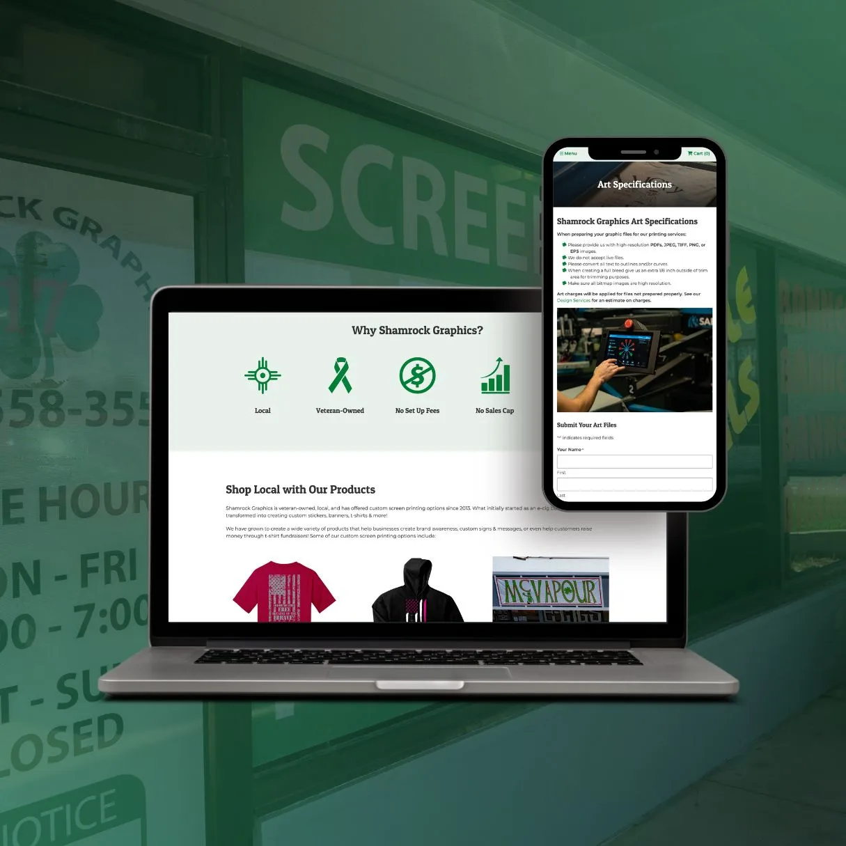Shamrock Graphics is a veteran-owned custom screen printing and graphics business in Derby, Kansas. They specialize in signs, banners, clothing, ball caps, team and sports shirts, labels, posters, vehicle and window graphics and more. The guys wanted customers to be able to order custom graphics, buy current shirt designs, and allow them to set up their own t-shirt fundraisers for teams and groups.